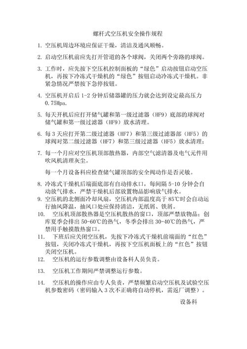 4、禁止空压机房存放易燃易爆物品,所需装用少量润滑油、清洗油的油桶、油壶、要存放在指定地点。(8) 空压机房要配备有消防器材,认真管理。不要随便移动或挪动它用。设备管理操作规程:(1 ) 运转前请检查下列各事项:(2) 检查各部分螺丝或螺母有无松动现象。