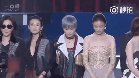 本来杨幂想站在外面的,结果被范冰冰一把拉进了中间。