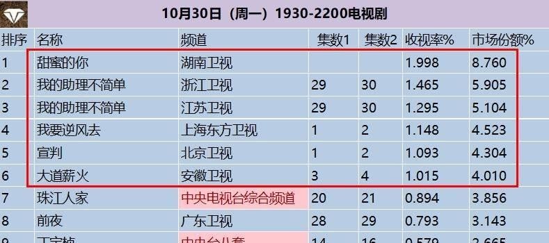 电视剧收视率排行榜来啦!赶快来看看本期的热门剧集吧。不同于往期,这次我们将为大家点评一些备受关注的剧集,带你了解每部剧的亮点与不足之处。首先,让我们来看看《甜蜜的你》。这部剧由黄子韬和王鹤润主演,讲述了一个宠物题材的故事。虽然一开始是为了看黄子韬而产生兴趣,但剧情却有些折中。评分虽然称得上是四星,但仍然有些勉强。剧中女主角手机摔坏后不解释的行为引起了观众的不满。尽管如此,当我们稍微冷静下来,继续观看时,剧情确实是有趣的。但是,剧集长达40集,有些过于冗长。下次希望黄子韬能够参演更逗趣的综艺节目,给我们带来欢乐。最后,希望大家能够爱护小动物,不要伤害它们。接下来是《我的助理不简单》。这部剧由王子文和邓婕主演,收视率分别为1.465%和1.295%。