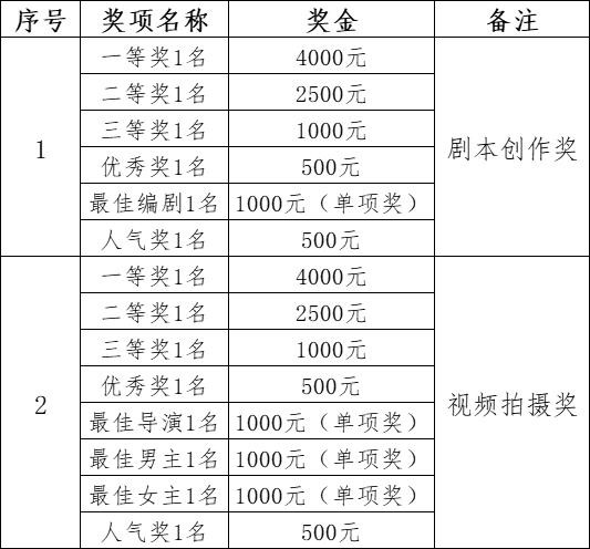 奖项设置包括编剧和拍摄各一等奖、二等奖、三等奖和优秀奖1名,并颁发相应的奖金和证书。同时,还将设置最佳编剧1名、最佳导演1名、最佳男主角1名、最佳女主角1名、最佳人气等单项奖,以表彰在比赛中表现突出的团队和个人。