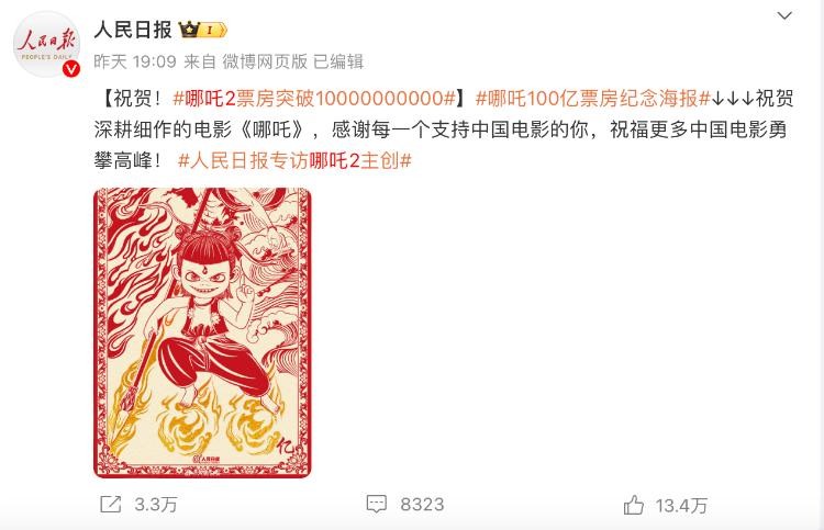 在《哪吒2》总票房破100亿元时,央视新闻、人民日报等央媒发文祝贺。包括贾樟柯、张艺谋等著名导演,贾玲、刘亦菲、张雨绮、宋茜、檀健次等多位艺人也纷纷转发祝贺。