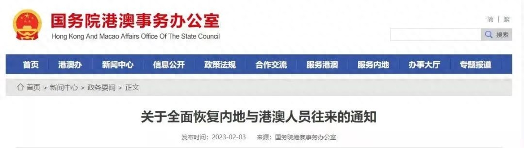根据国务院联防联控机制综合组发布的《关于全面恢复内地与港澳人员往来的通知》,为给内地与港澳人员往来提供更大便利,6日零时起,全面恢复内地与港澳人员往来。取消经粤港陆路口岸出入境预约通关安排,不设通关人员限额。恢复内地居民与香港、澳门团队旅游经营活动。