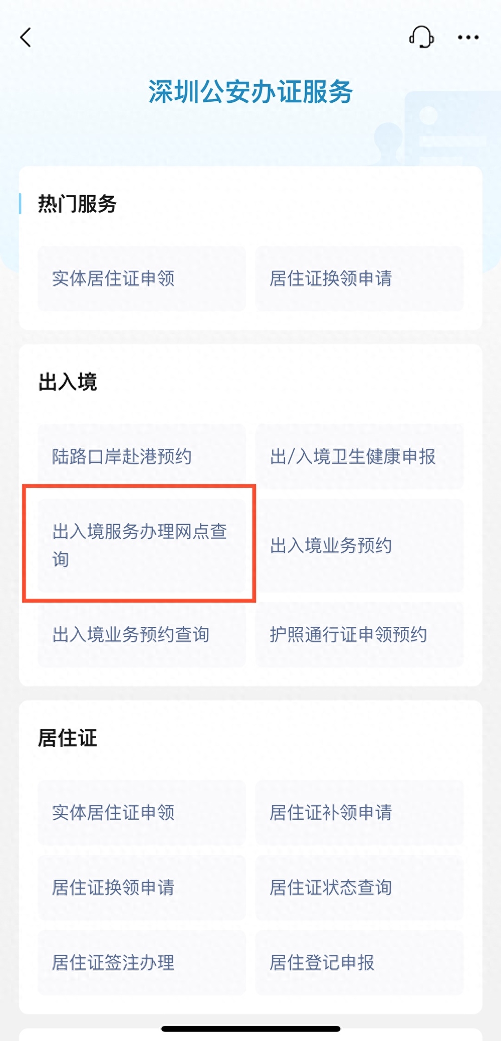 在“城市服务-公安办证”页面,点击“出入境服务办理网点查询”,即可按照所在地区选择办事网点。