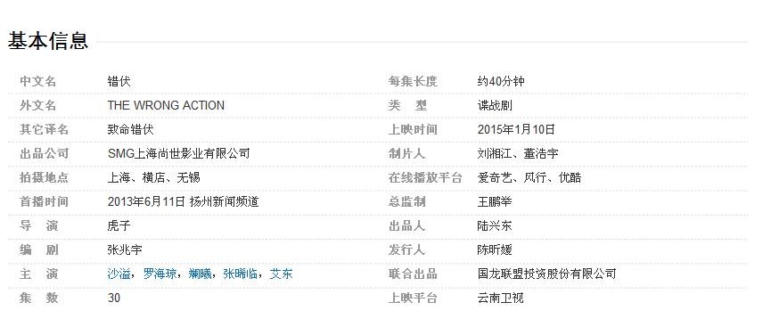 电视剧《错伏》由虎子导演执导,罗海琼、沙溢、斓曦、张晞临等主演的谍战电视剧。