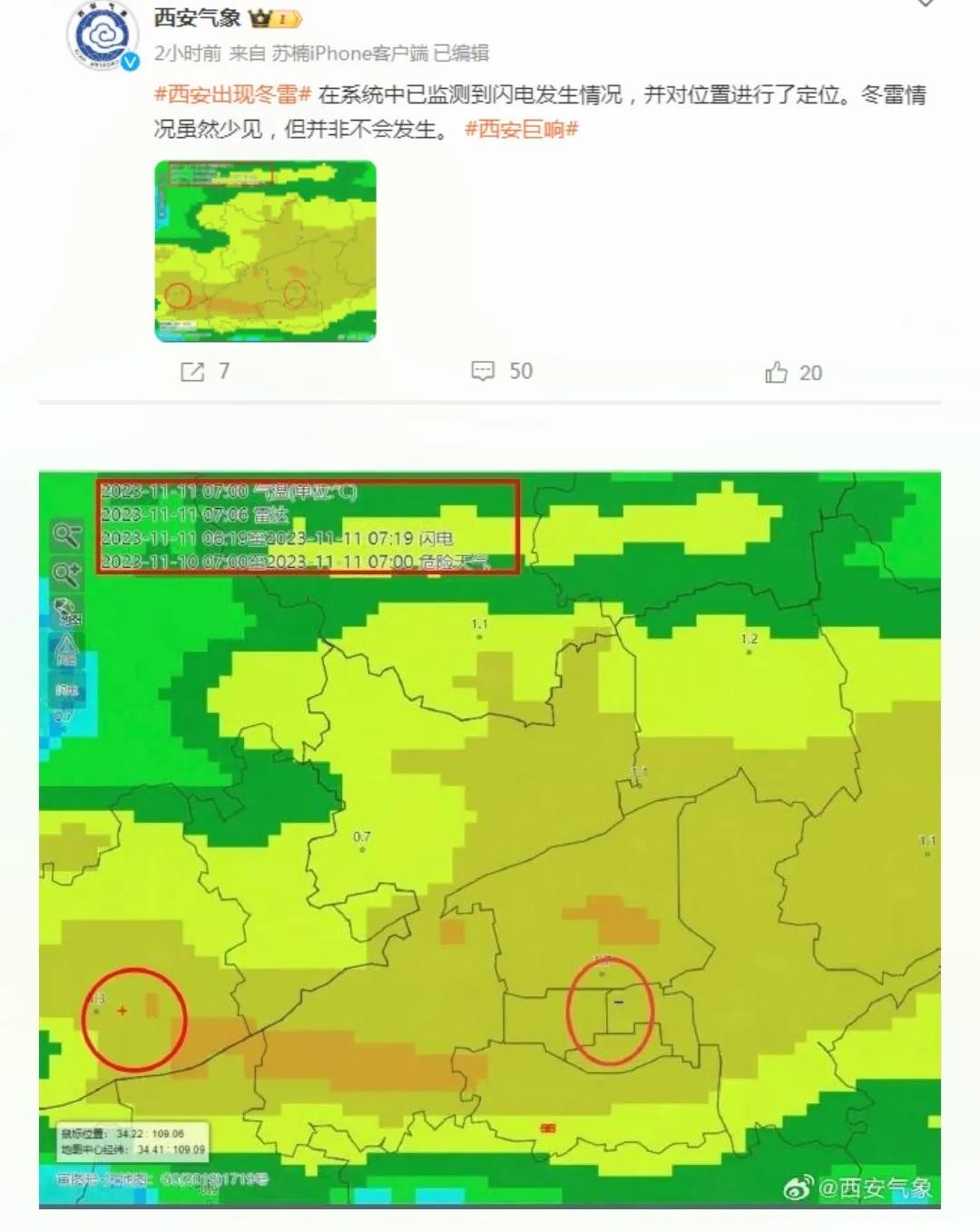 根据西安气象官方微博的消息,他们已经在系统中监测到了闪电的发生情况,并进行了定位。虽然冬季雷声不常见,但是西安的市民们确实在那个早晨听到了惊人的巨响。