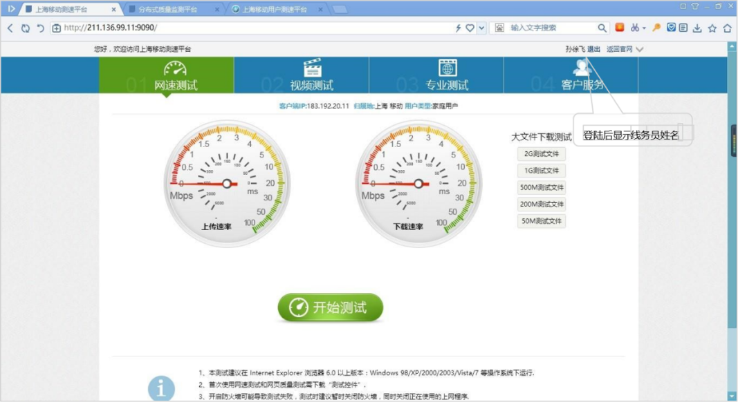 当你感觉宽带网速慢时,首先你可以前往上海移动官方测试平台进行测速(建议使用IE浏览器并有线连接测试三次),测速平台地址如下:http://211.136.99.11:9090/;打开网站后点击“宽带测速-开始测速”按钮,等待测速完成后显示当前网速,测试过程需持续一段时间。测试结果出来后,这里会显示本次测速评价是否正常。