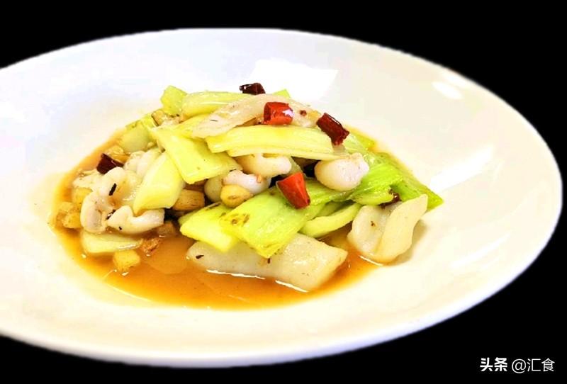 - 起锅烧热油,放入姜粒、辣椒段爆香,下入龙牙菜、墨鱼大火翻炒。
