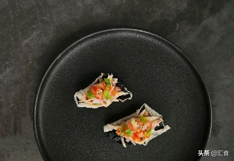 - 取手撕鸡和松茸混合,再用盐、花生碎、白芝麻、芝麻油拌匀,放在海苔脆上面,在表面摆上少许的番茄莎莎,最后用香菜叶点缀即可。