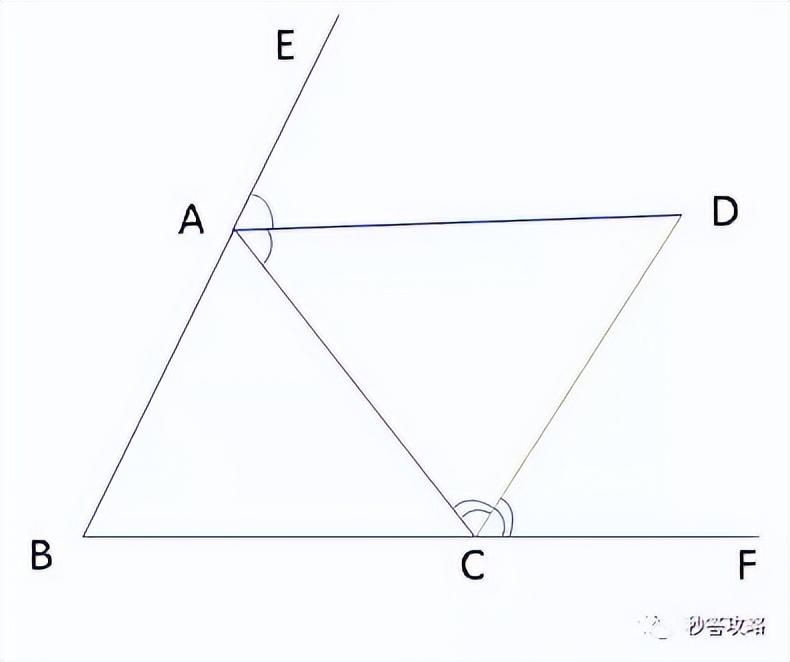 外角关系:三角形的外角等于与它不相邻的两内角和