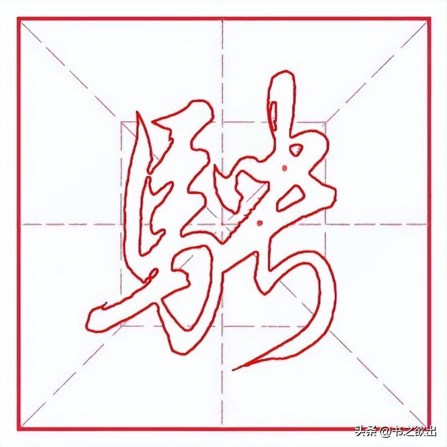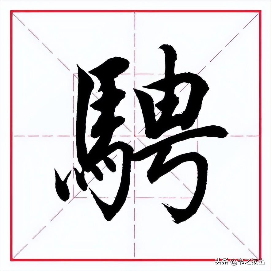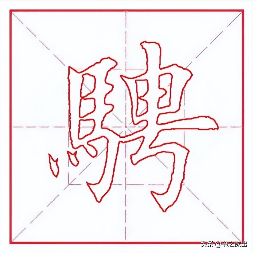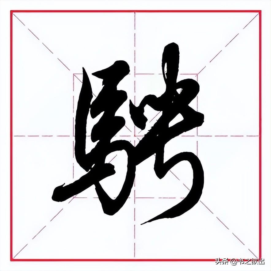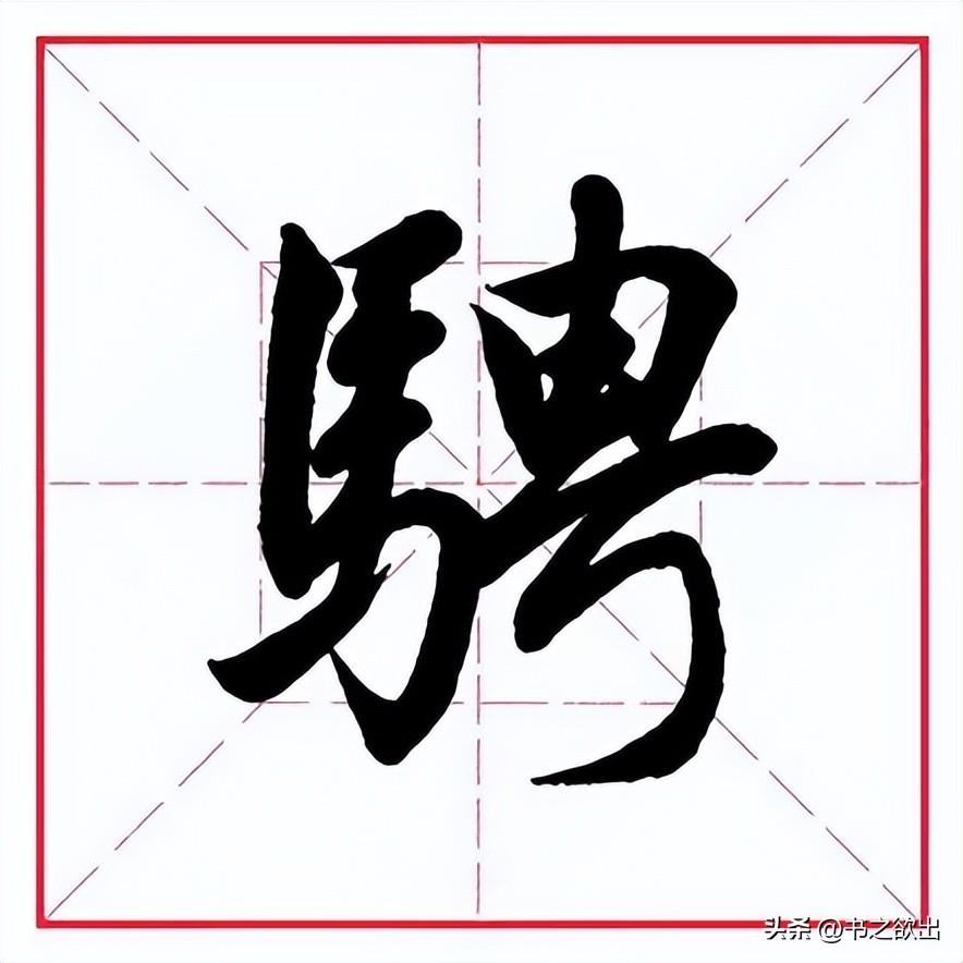 左边“马字旁”勿宽,左竖斜切起笔,向下略轻,稍带弧度;第二笔横画虚接起笔,向右大抗肩;下面两横均露锋起笔,抗肩与上横平行,比上横略短,且间距相等;竖笔从首横里面实接起笔,收笔稍向左带;横折钩与左竖实接起笔,横画勿重,抗肩,与上面横画等距,过右竖后稍提锋顿笔下行写竖,左斜,到位后以“跪笔弹锋”出钩,内圆外方;四个点笔简化为三点,整体上靠,顺着横画的走势由低到高,大小均匀适当,指向各异。