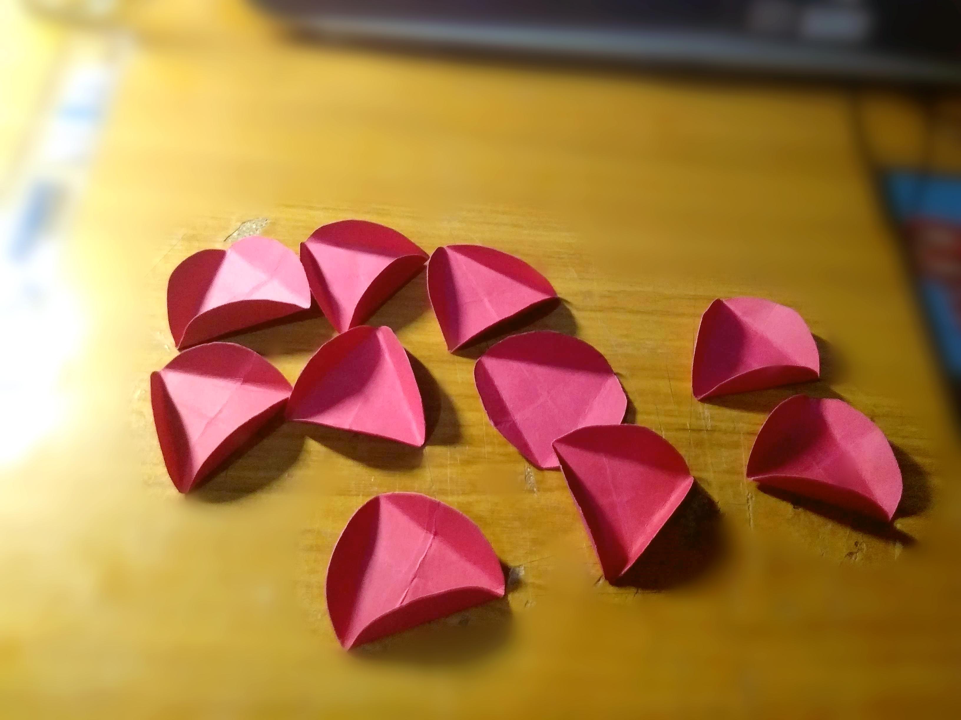 把圆形沿着中心点折出三个弧形,三条边组成三角形。十个圆都这样叠好,把折线立起来。
