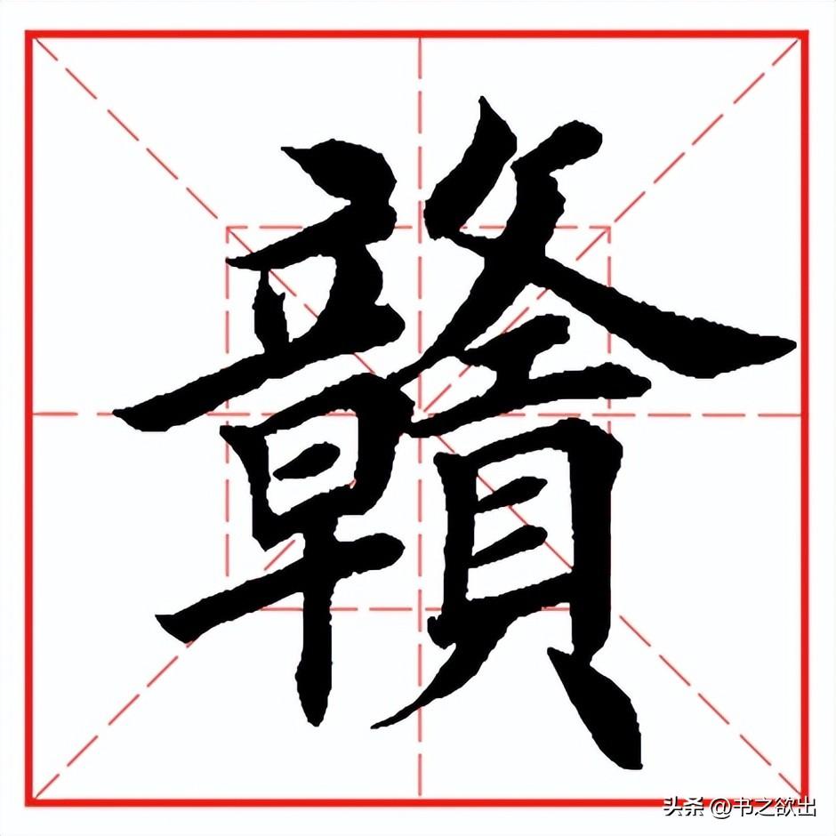 下面“贡”字紧凑上靠,“工”部形体扁宽,斜势抗肩;“贝”字与上面重心对应,左竖稍带弧度,横折横画抗肩,到位后折笔向下内擫写右竖,竖身稍重稍长;中间两个小横抗肩圆收,底横托住左竖的收笔,与上面横画平行等距,收笔藏于右竖;小撇从底横里面实接起笔,撇身稍直,短促有力;右点形体略长,角度稍立,重心下坠。