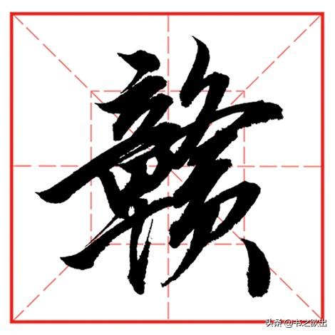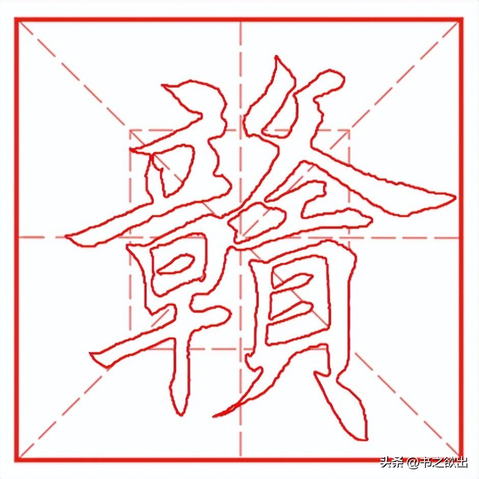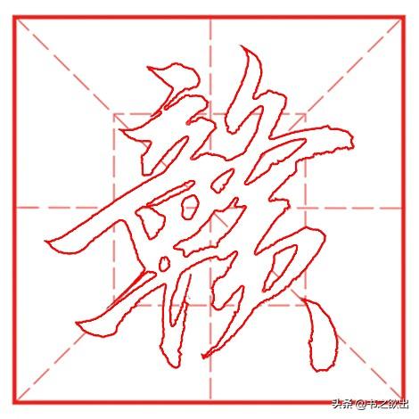 首点位置靠右,角度略平;横画起笔露锋,抗肩,右部勿长;下面两个点笔左低右高,笔断意连,互相呼应;长横起笔左探,抗肩与上横一致,右部收敛;“曰”部斜势抗肩,上宽下窄;底横起笔角度略方,与上面四个横画平行等距,右部收敛以让右;竖笔从“曰”部底横里面实接起笔,竖身稍左斜,收笔垂露。