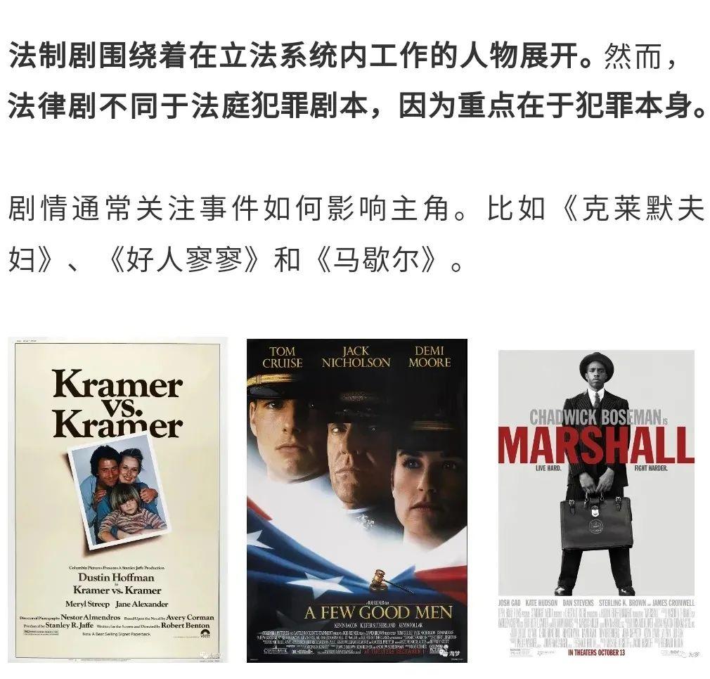 此外,故事往往由所有主要案件组成。主要焦点往往是案件的具体细节,因为它是在法庭上解决的。如电影《桃色血案》和电视剧《傲骨贤妻》也是一个典型的例子。