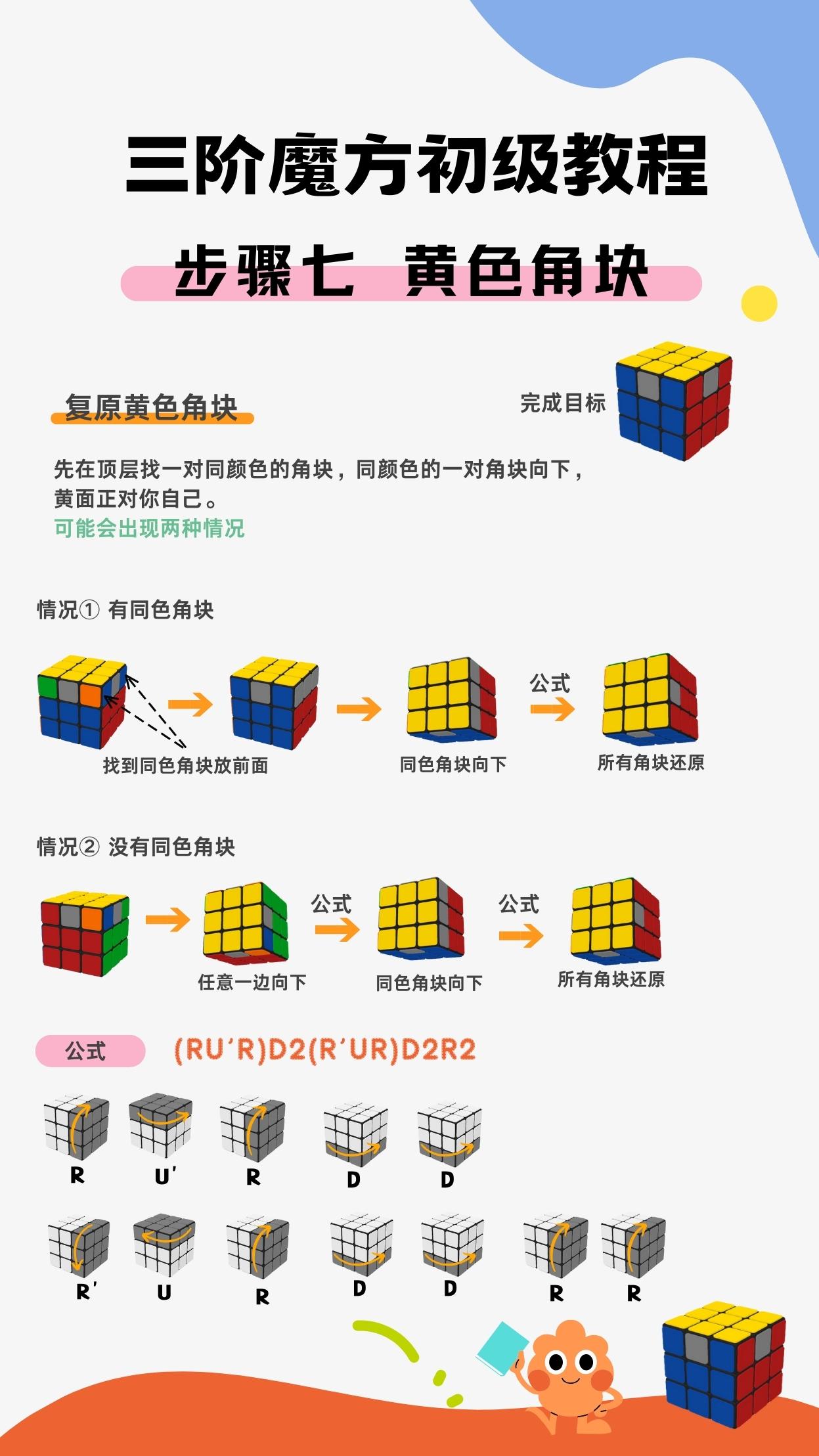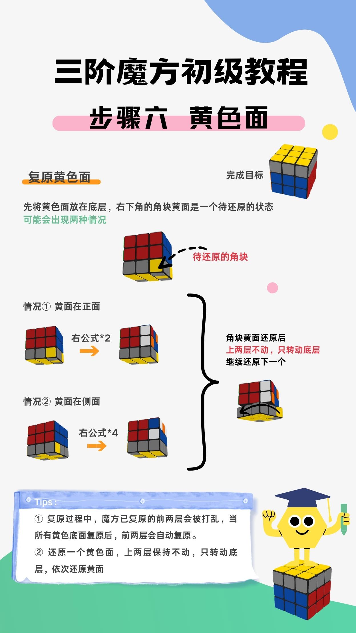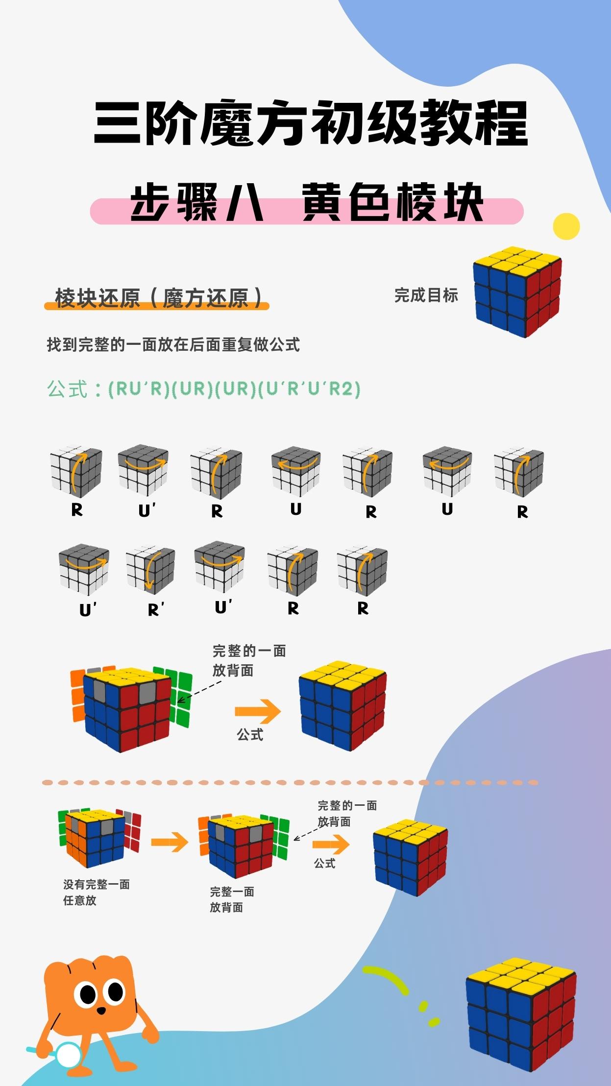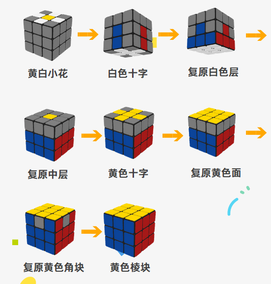 复原步骤一共是8步,黄白小花→白色十字→复原白色层→复原中层→黄色十字→复原黄色面→复原黄色角块→复原黄色棱块(魔方还原)