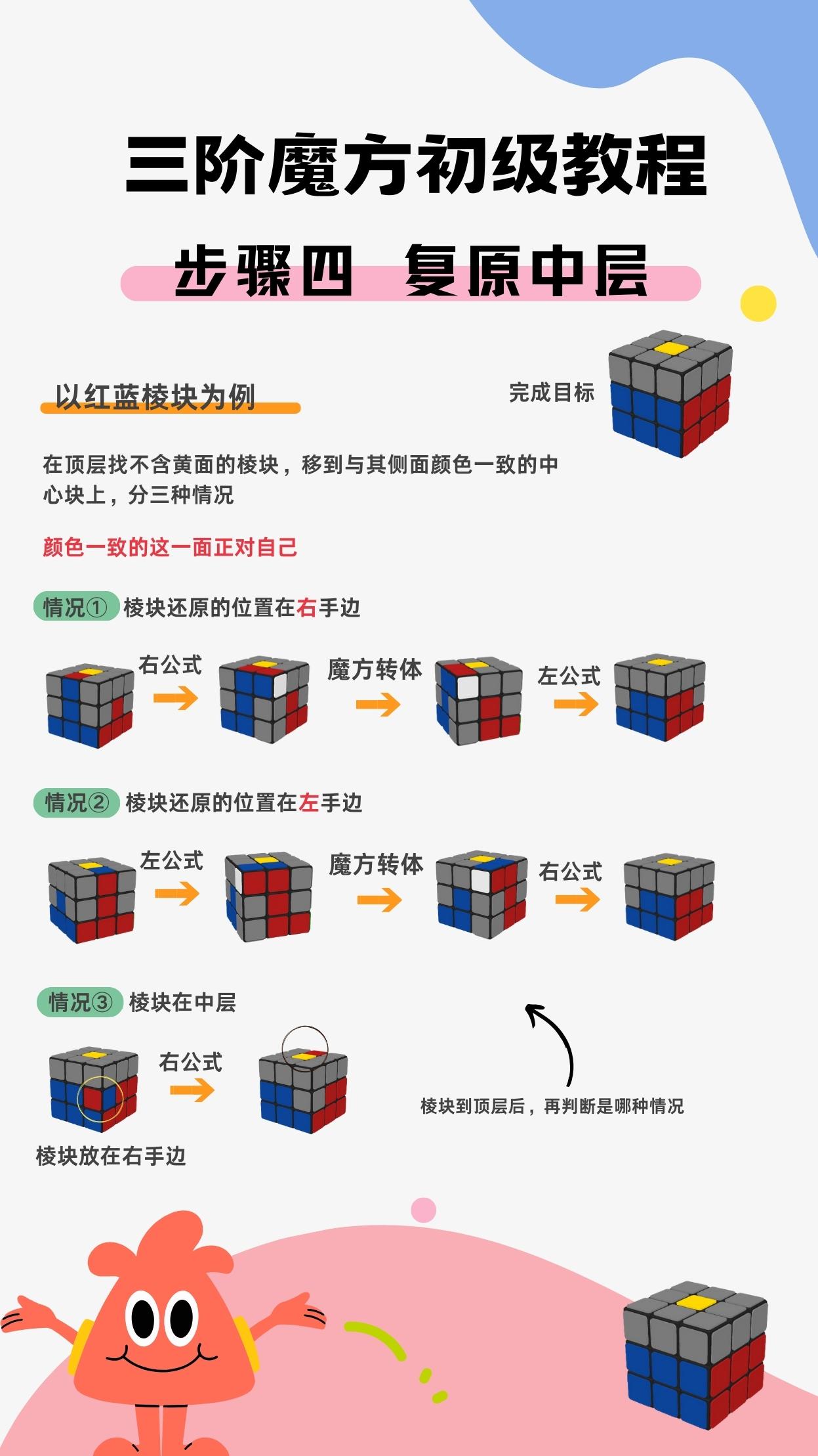 这一步没有公式,有个技巧,当棱块在顶层或者底层的时候,先转到中层,再根据白色面的方向转到顶层去。