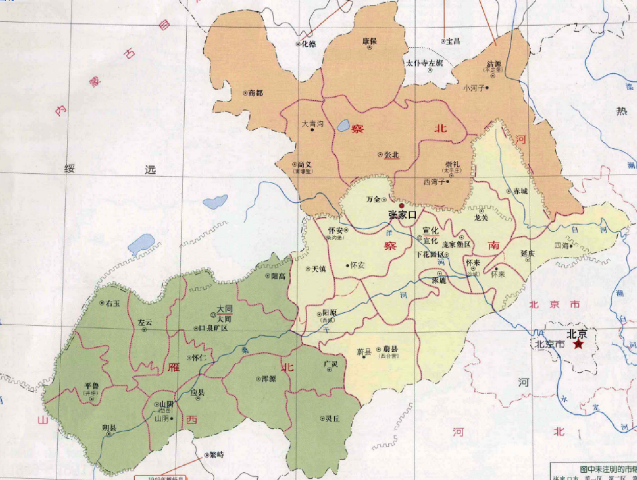 察哈尔转头拿走了原直隶省口北道的10个县(万全、赤城、宣化、龙关、怀来、阳原、怀安、蔚县、延庆、涿鹿),省政府搬回了万全县治张家口;