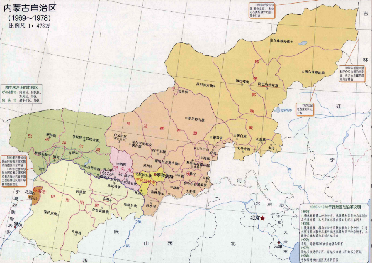 1969年至1978年,出于防范苏联的考虑,由于内蒙古的国境线过长,周边省份接管了部分内蒙古的辖区。除去前一篇文章中提及的东三省外,甘肃接管了阿拉善右旗的大部分地区和额济纳旗,而宁夏接管了阿拉善右旗的其余地区以及阿拉善左旗。1979年,内蒙古自治区的版图基本恢复原状。
