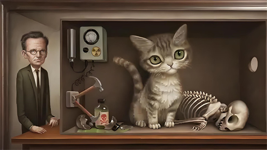 如果原子衰变了,放出的α粒子会触发机关,打破毒气瓶,那么猫就注定要死亡;但如果原子没有衰变,那么毒气瓶依旧完整,猫自然也就能安然无恙。问题是,在不知道原子何时会衰变的情况下,我们无法确定盒子内的猫是活着还是已经死了。只有当我们打开盒子查看时,猫的生死才会确定。