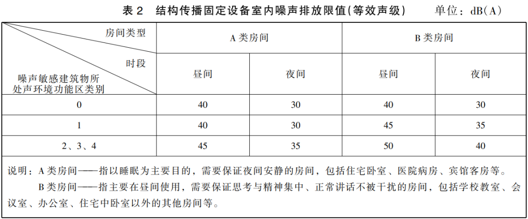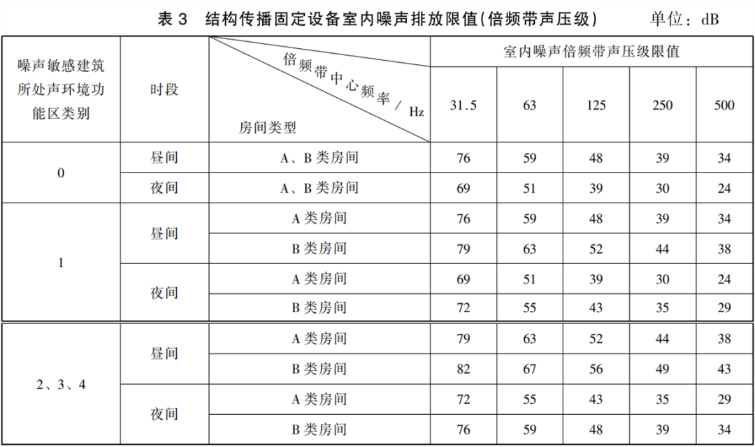 当固定设备排放的噪声通过建筑物结构传播至噪声敏感建筑物室内时,噪声敏感建筑物室内等效声级不得超过表2和表3规定的限制。(也就是我们常说的振动类低频噪音)