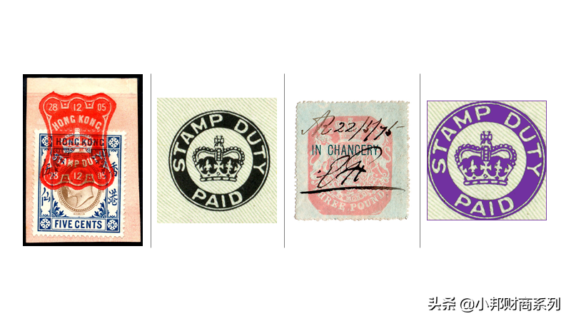 Stamp 一词的运用是直观地说出印花税的样子,要么就是在文件上戳一个印章,要么就是贴一张大小像邮票的标签纸,外加印章。