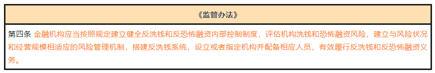 《监管办法》本条为新增条款,对金融机构的反洗钱义务做了概括性表述,包括建立内控制度、评估风险、建立风险管理机制、搭建系统、机构及人员要求等,对金融机构须履行的各项反洗钱义务作出了明确要求,属于补强性条文调整。