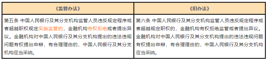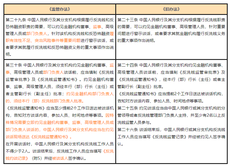 《监管办法》增加了金融机构监事及部门负责人作为谈话主体的规定,并规定约谈部门负责人,由反洗钱部门负责人批准即可,并删除了《旧办法》中对于约见谈话主持主体的规定,一定程度上降低了约见谈话的程序要求。此外,《监管办法》增加了因特殊情况需要立即约谈的,可以在约谈现场送达《反洗钱监管通知书》的规定。