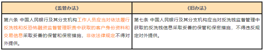 《监管办法》本条是对监管机构的保密义务作出要求,相比于《旧办法》,明确将“客户身份资料和交易信息”纳入保密范围,并明确了监管层面工作人员的保密义务,与“非依法律规定”不得提供的严格要求,在信息资料保密层面,监管机构将与金融机构共同承担保密义务。
