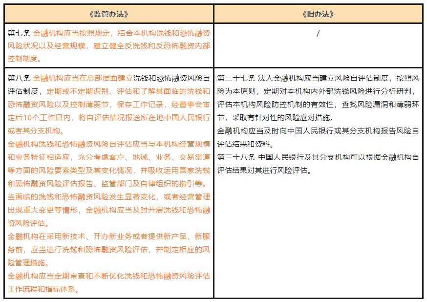 相比于《旧办法》,《监管办法》新增内部控制制度条款(第七条),并对金融机自评估制度的相关要求进行扩展及细化。《旧办法》仅规定金融机构应建立风险自评估制度,定期进行风险自评估,并向监管机构报告风险自评估结果和资料。《监管办法》将风险自评估制度的建立层级确定为金融机构总部,且金融机构可以自行决定定期或不定期进行评估,赋予了金融机构更大的自主性。为强化金融机构对风险自评估工作的重视,《监管办法》规定自评估情况须先经董事会审定,而后报送至监管机构。