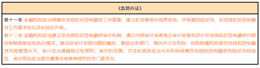 本处为《监管办法》新增条款,强调金融机构须完善信息系统,并建立审计机制。就审计而言,金融机构可以选择内部审计或独立审计,审计的范围、方法和频率须与机构规模和风险状况相适应,并将报告提交董事会或专门委员会,属于对于现有反洗钱监管要求的强调与细化,无额外关注点。