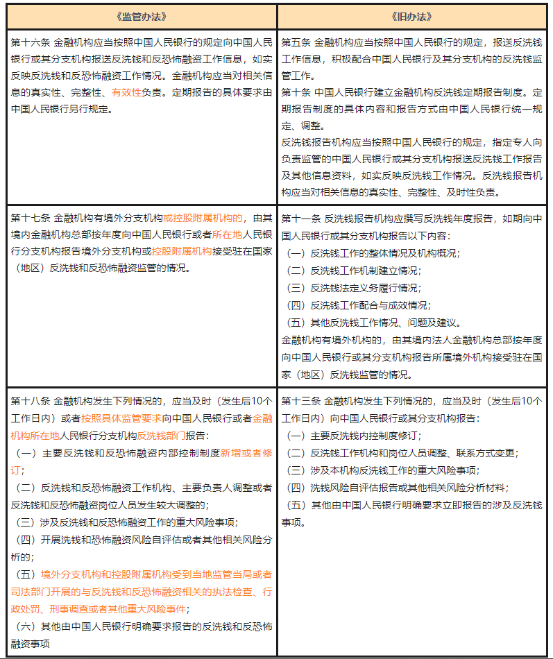 《监管办法》基本延续了《旧办法》的规定,对金融机构的报告义务进行规定,包括常规的报告义务、涉及境外分支机构的报告义务以及特殊情况下的报告义务。