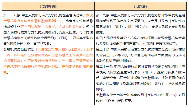 《监管办法》在本条规定了监管提示这一监管方法,即监管机构在监管活动中发现金融机构存在“风险隐患”或工作“存在明显漏洞,需要提示金融机构关注的”,可以向金融机构发出《反洗钱监管提示函》要求采用必要的风控措施,本处对《旧办法》中规定直接发出《反洗钱监管意见书》的规定条款作出了修改。此外,《监管办法》删除了电话或书面质询的相关规定,仅要求金融机构须在收到《反洗钱监管提示函》之日起15个工作日之内作出书面答复,且该书面答复须由分管反洗钱的工作负责人签批,强化了机构与监管沟通的正式性与正当性。