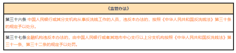根据《反洗钱法》第三十一条[1]、第三十二条[2],如金融机构违反《监管办法》,金融机构可能被处以限期改正、罚款、责令停业整顿或吊销经营许可证等处罚,直接负责的董事、高管和其他直接责任人员根据情节情况,可能被处以纪律处分、罚款、取消任职资格、禁止从事有关金融行业工作的处罚,此等条款并非新增规定,为出于规定完整性角度所做调整。