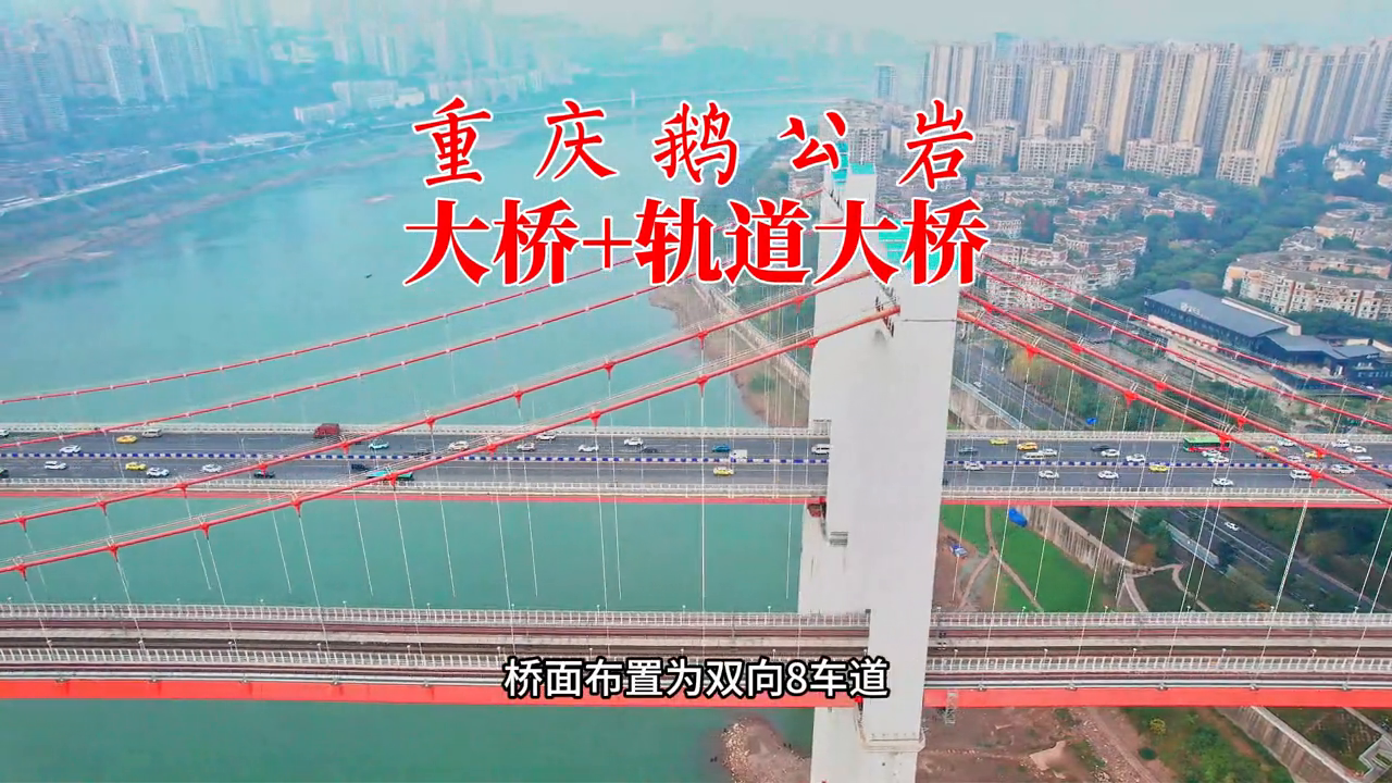 鹅公岩大桥西起于九龙坡区鹅公岩立交,东止于南岸区赵家坝立交。正桥全长1.42千米,桥面布置为双向8车道,设计最高速度为80千米/小时。