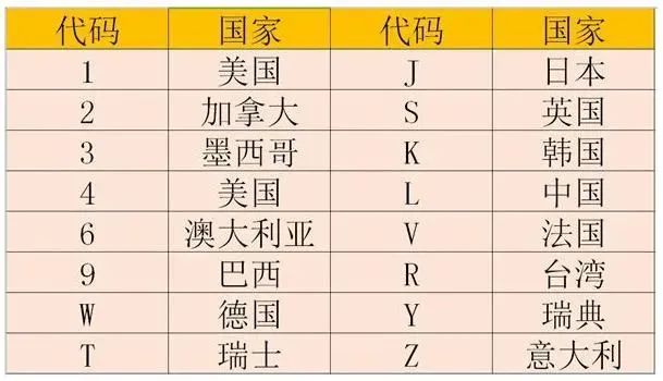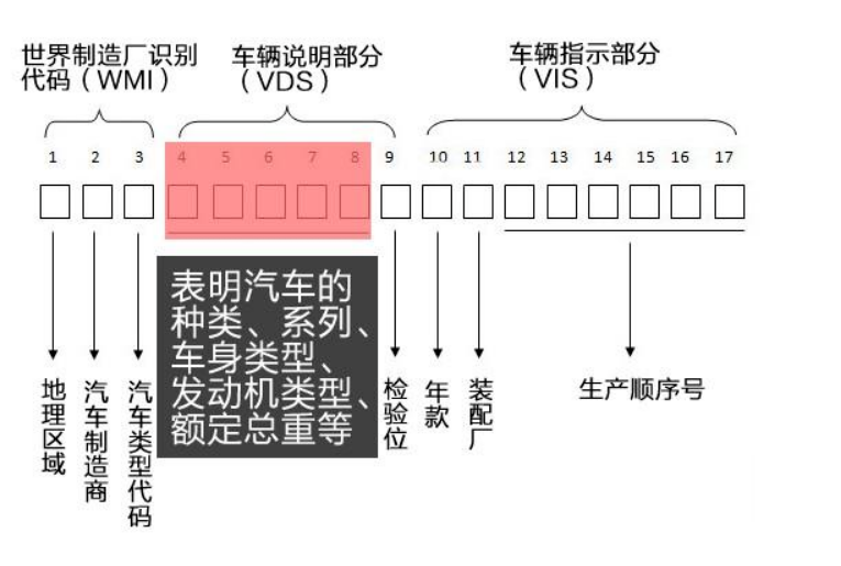 - 1~3位,代表着全世界汽车制造厂识别代码,3个字符分别表示车辆的生产国家、制造商、汽车类型。