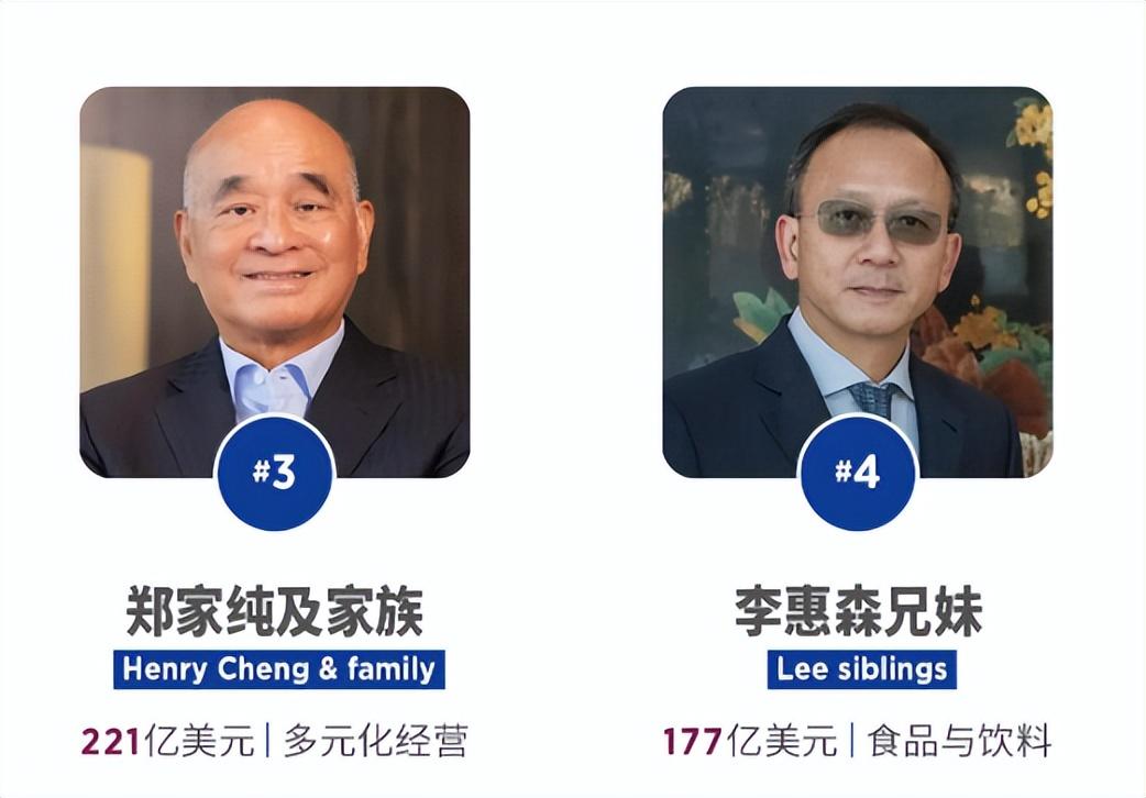 根据榜单具体来看:位于中国香港富豪榜前十的分别是,李嘉诚,362亿美元;李兆基270亿美元;郑家纯及家族221亿美元;李惠森兄妹177亿美元;吴光正137亿美元;刘銮雄131亿美元;吕志和121亿美元;邝肖卿114亿美元;蔡崇信85亿美元;蔡志明82亿美元。