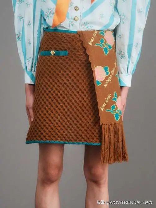 服装上通过结构线拼接的形式,运用在连衣裙、大衣、针织衫等单品中。夸张的超长和及地流苏细节为简约连衣裙带来升级,打造出吸睛的飘逸气质,凸显灵动感。