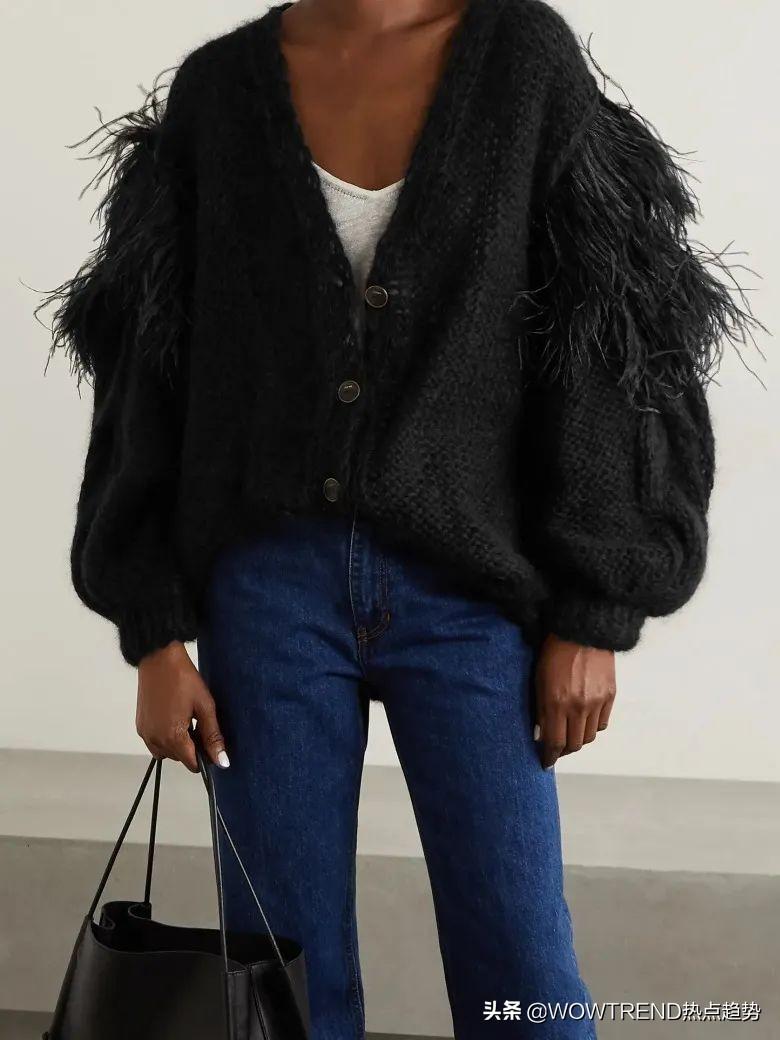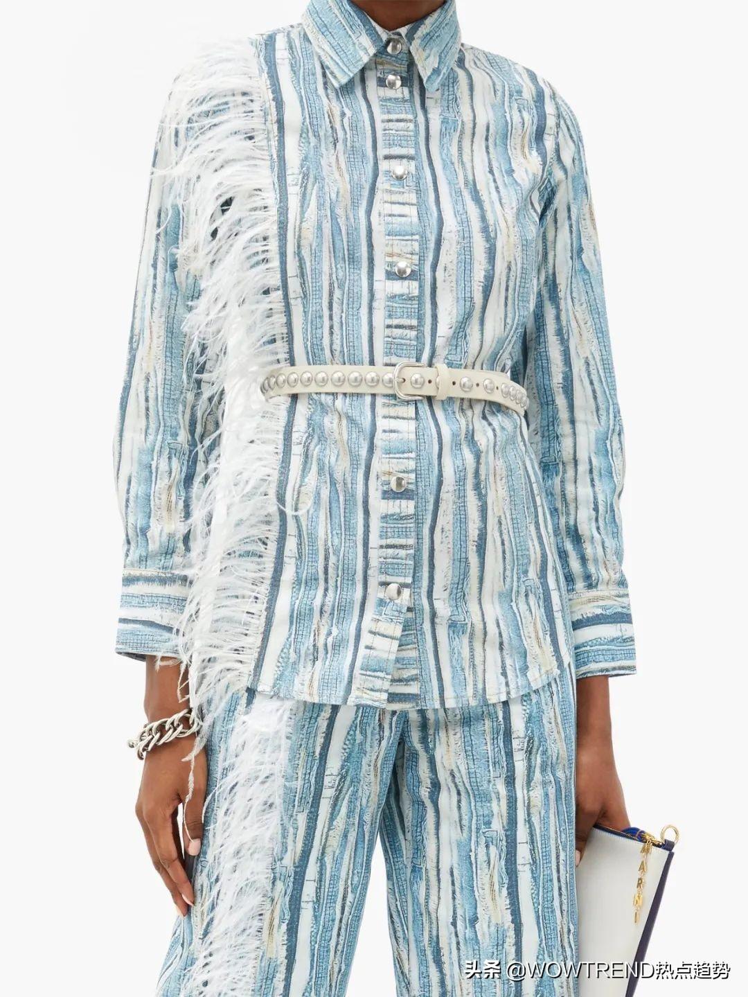 羽毛状流苏通过在门襟、下摆、肩缝、腰头、袖口等边缝、 开断位置镶嵌分布。