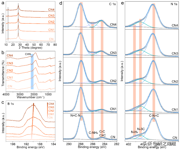 作者接着通过XRD、FTIR及XPS等表征手段确定了缺陷的存在形式(氰基)及硼掺杂位点(二号氮),作为后续理论计算的建模依据。