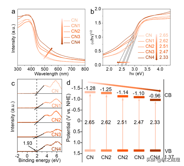 通过紫外可见漫反射图片研究了所制备材料的光吸收能力,发现优化后的g-C3N4不仅吸收边发生了红移,还出现了一个新的吸收带。该吸收带源自于氮缺陷位点的孤对电子的跃迁。结合漫反射光谱的换算和XPS价带谱,作者确认了所制备材料的能带结构,发现优化后的g-C3N4导带位置呈下移趋势,而价带位置基本保持不变。