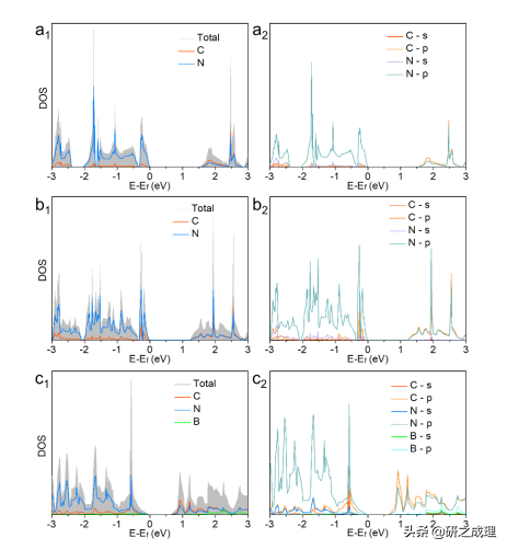 ▲图4.(a)普通g-C3N4,(b)缺陷g-C3N4及(c)硼掺杂和缺陷共修饰g-C3N4的DFT模拟DOS图。