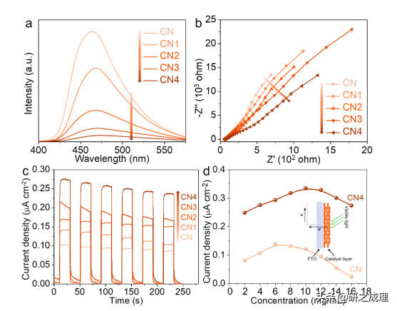 光致发光光谱表明修饰后的g-C3N4拥有更高的电荷分离效率,而电化学阻抗及光电流测试则表明修饰后的g-C3N4表现出更为出色的电荷转移能力,这将极大的提升光生电荷的利用率。