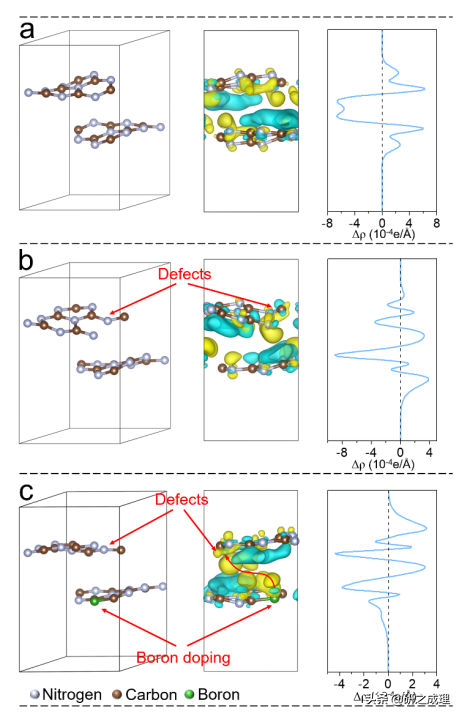 作者通过对不同结构模型的g-C3N4进行密度泛函理论计算,发现缺陷位点和硼掺杂都能引起g-C3N4禁带宽的降低从而增加其吸光能力。