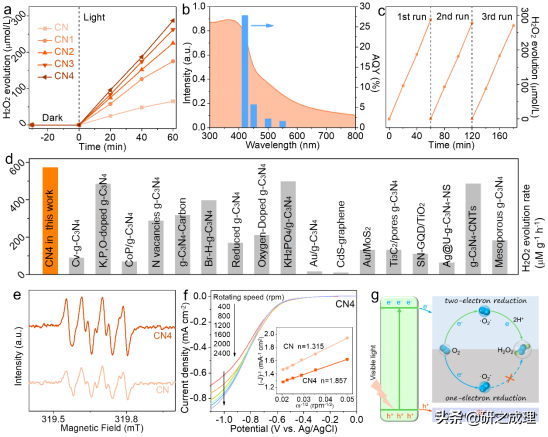 ▲图7.可见光所制备材料的(a)双氧水产量、(b)量子效率、(c)稳定性及(d)和其它光催化剂的双氧水产量对比。(e)中间产物测试,(f)旋转圆盘电极测试,(g)双氧水生成路径。