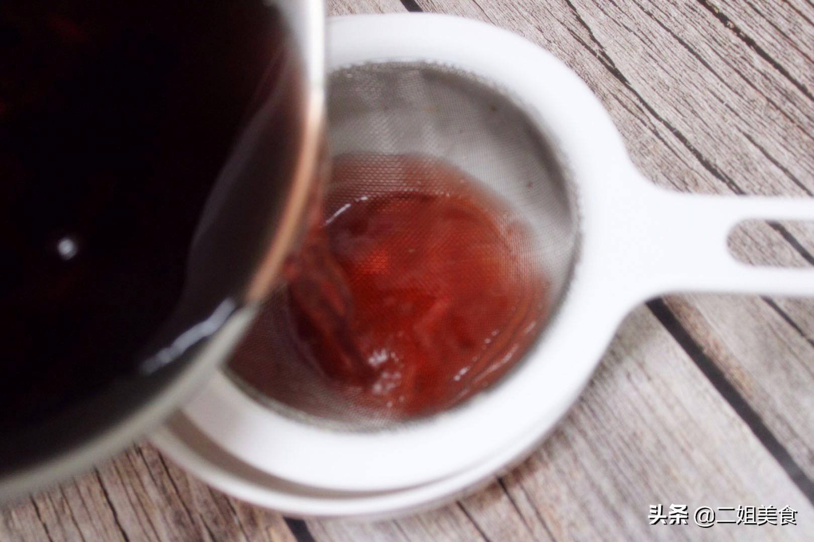 5、熬煮好酸梅汤之后,我们用滤网将酸梅汤过滤一下,这样喝酸梅汤的时候就会很细腻了。