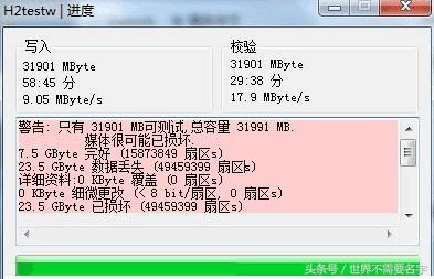 好了,下面是拷贝满后我们在来校检资料的完整性。可以看到只有7.5G的资料是完整的。那也就是说这是一张8G扩容32G的卡。而17.9M/的就是这张卡的读取速度。写入速度和读取速度都可以检测的出来。
