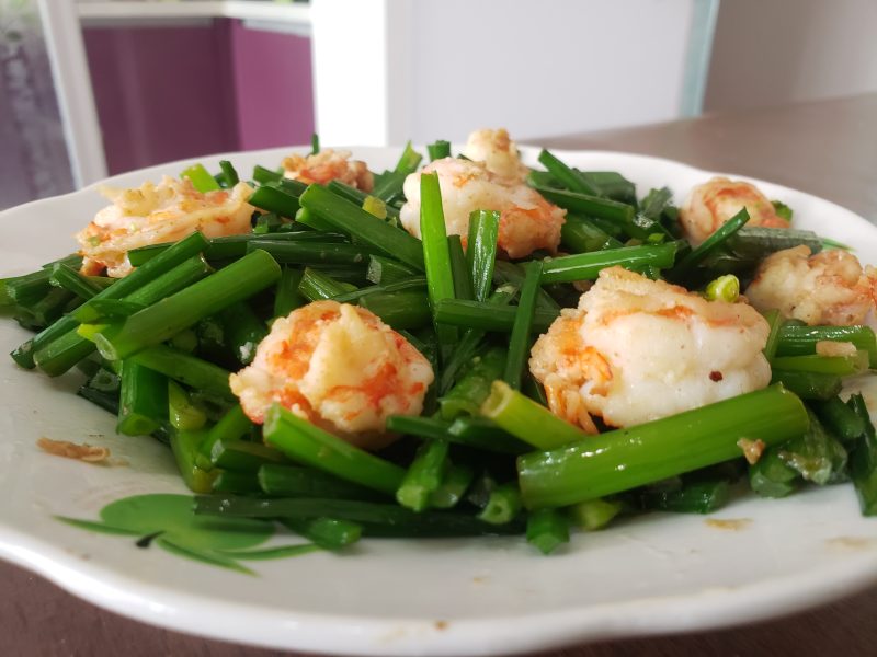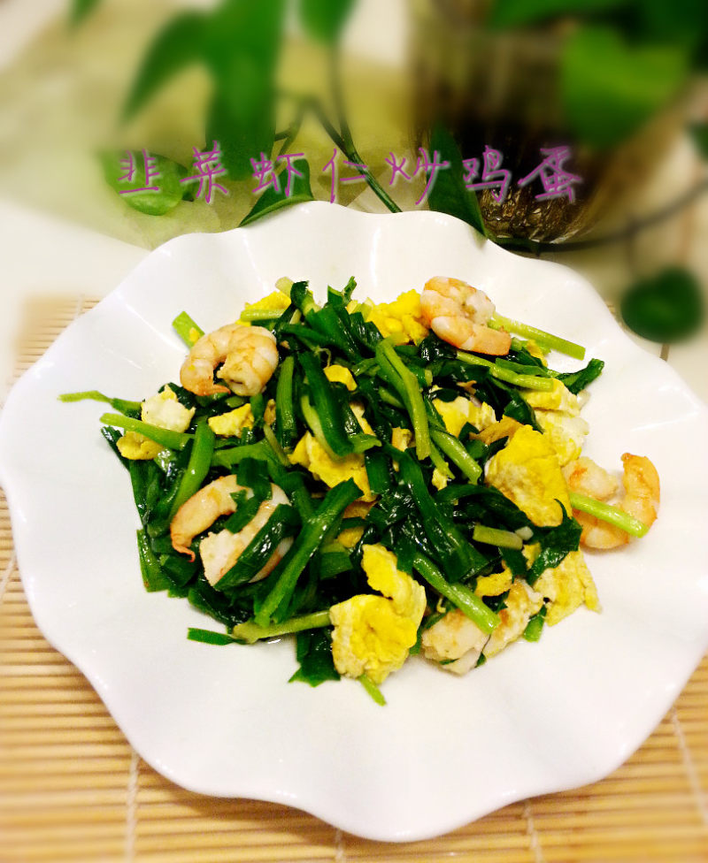 5:平底锅烧热放少许油,倒入虾仁翻炒至变色,再倒入韭苔,翻炒一下,断生后加少许盐调味即可。