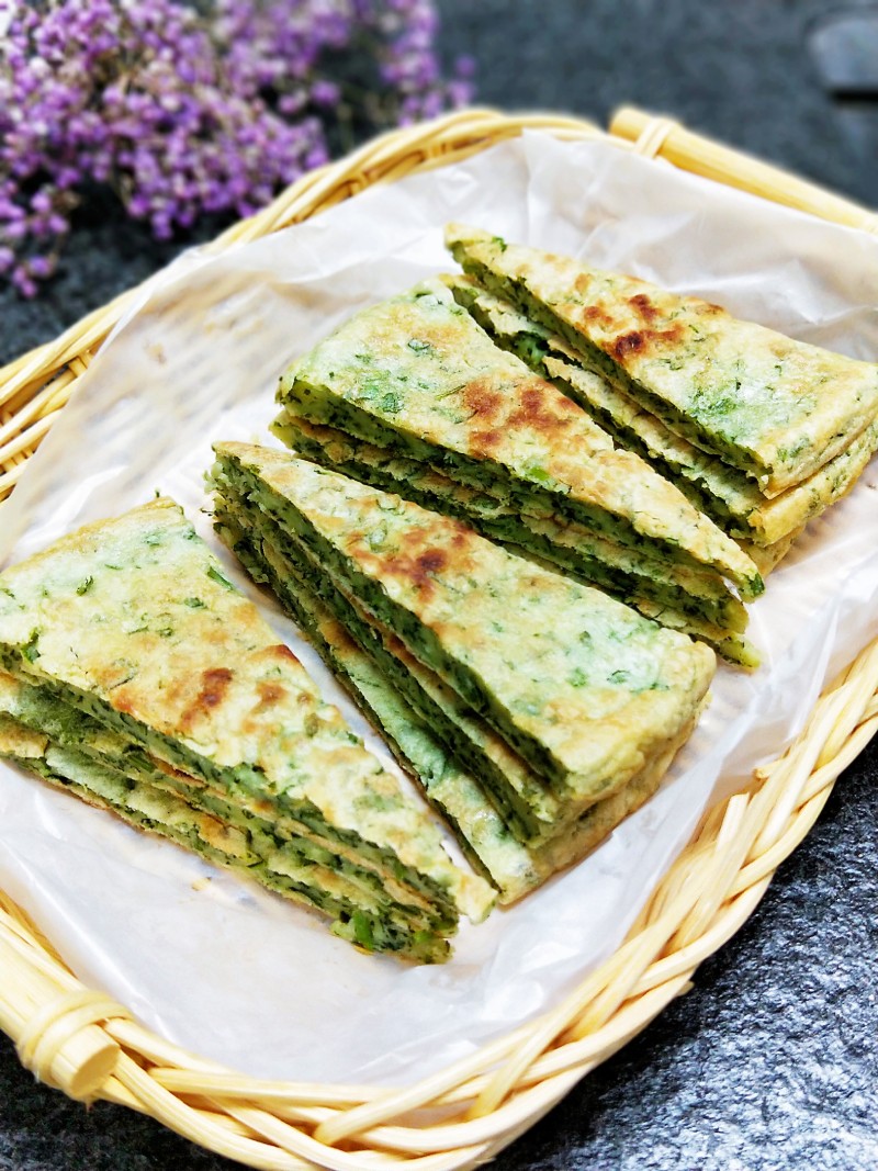 9:取煎饼,切成块,清淡的艾草甘香,非常好吃哦!