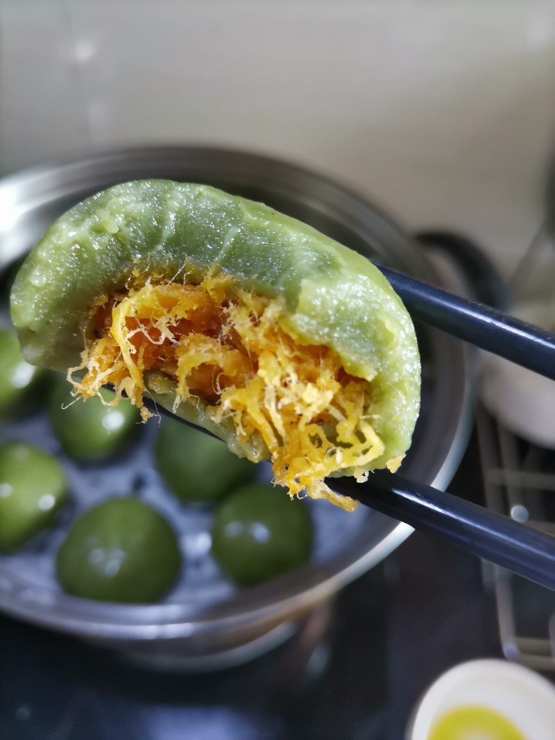 12:青团出炉,咬一口,艾叶的清香味和蛋黄肉松的香味一起,冲撞味蕾,美哉!