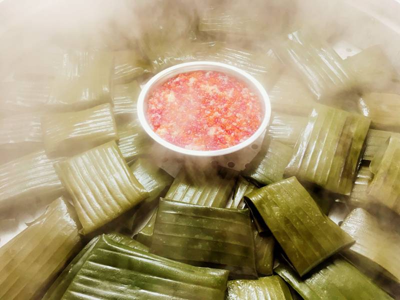 蒸屉上可以铺棕叶或玉米皮防粘都行。